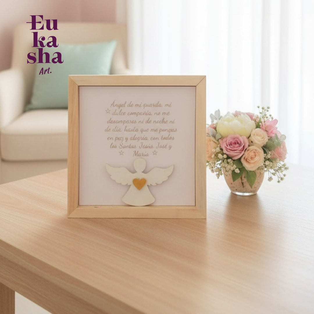 En su centro, un ángel pintado a mano representa la luz y la protección divina que acompaña nuestros días, mientras la Oración del Ángel de la Guarda envuelve el espacio con fe, calma y gratitud.