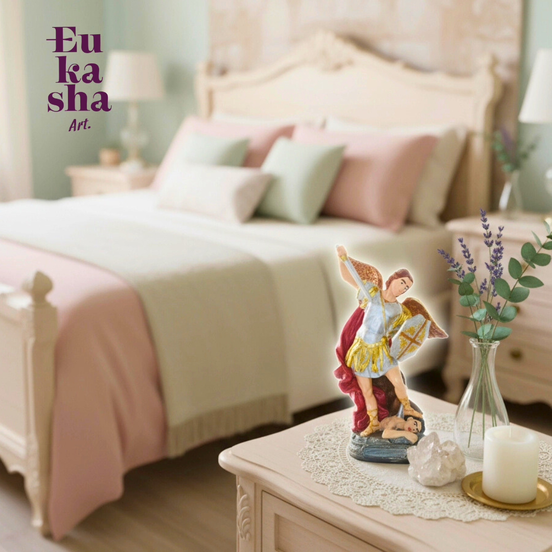 El Arcángel Miguel es conocido como el gran protector y guerrero de la luz. Su energía simboliza la valentía, la justicia y la fuerza espiritual que nos ayuda a vencer los miedos y a mantenernos firmes en la fe. Tener su presencia en tu hogar es abrir un espacio de resguardo, fortaleza y confianza en el camino.