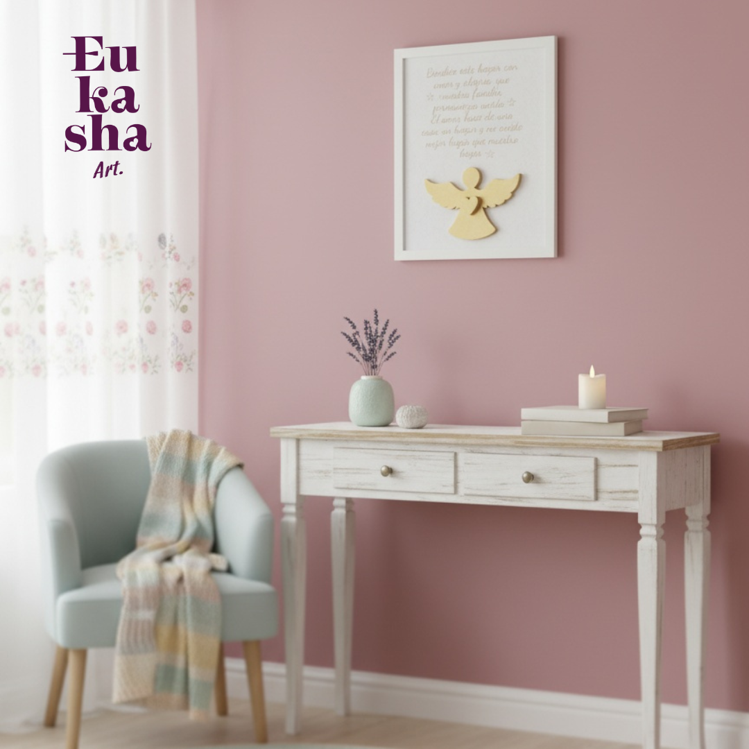 En el centro, un ángel pintado a mano representa la luz que guía y resguarda el hogar.